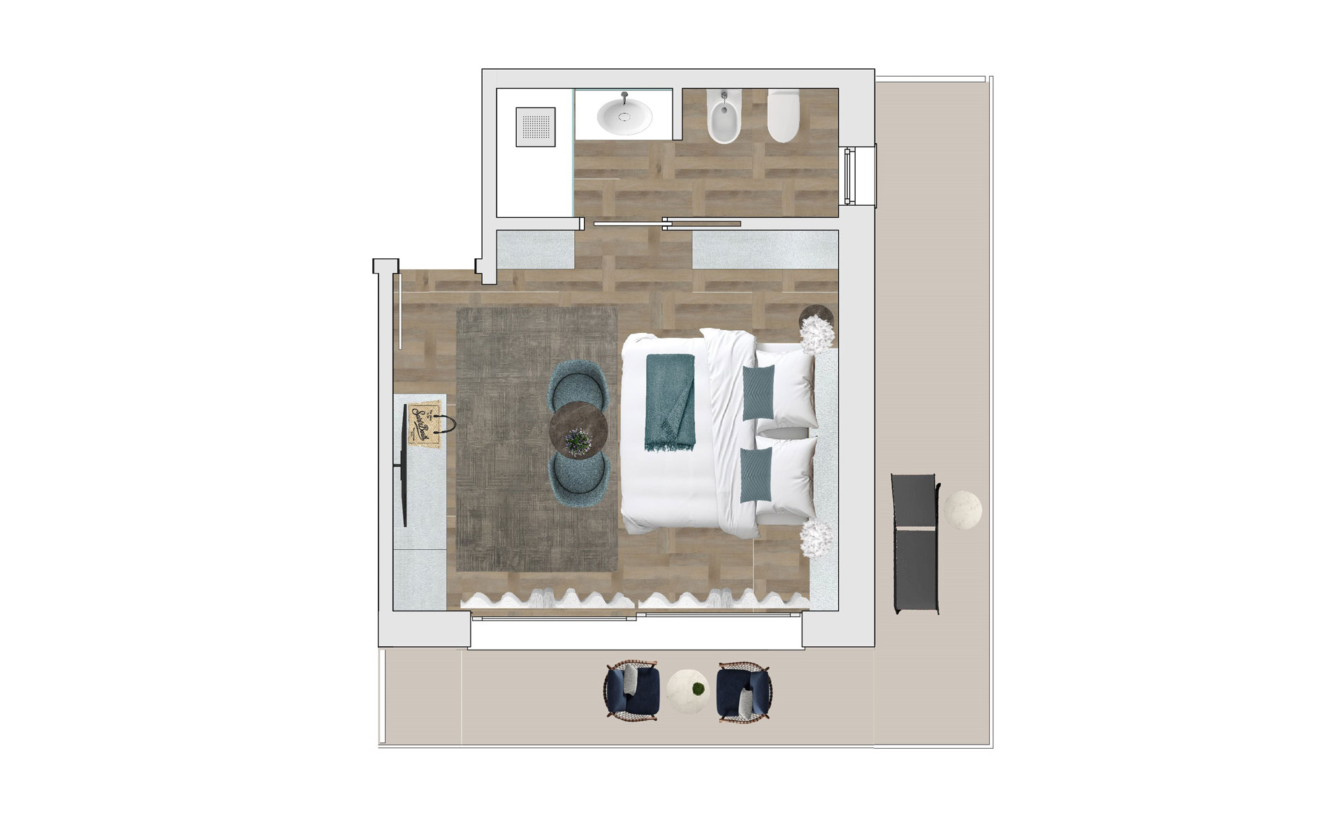Da ogni terrazzo si accede ad una ulteriore area comune con spazio esterno, zona relax e lettini.